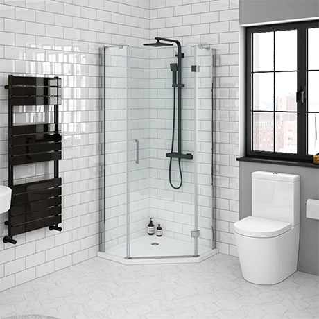 A super sleek frameless pentangle shaped shower enclosure, the Apollo features a stylish minimalist design which will sit beautifully in the corner of any style of bathroom.