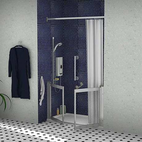 Designed for independent & assisted showering to help retain water in the shower area, the Milton Front Access Half Height Twin Bi-Parting Shower Doors are ideal for use on shower trays or in wetrooms providing ease of use & installation. The doors are glazed with PET environmentally friendly impact resistant glazing as standard. The flip over latch will prevent door movement should a carer lean against them & will provide a more rigid enclosure while the rise & fall hinges lift the door by at least 10mm & are easy to operate & highly manoeuvrable. The Easy to grip ‘D’ handles supplied for users with limited strength. Supplied as standard with a 2000mm drop antibacterial protected shower curtain and rail.